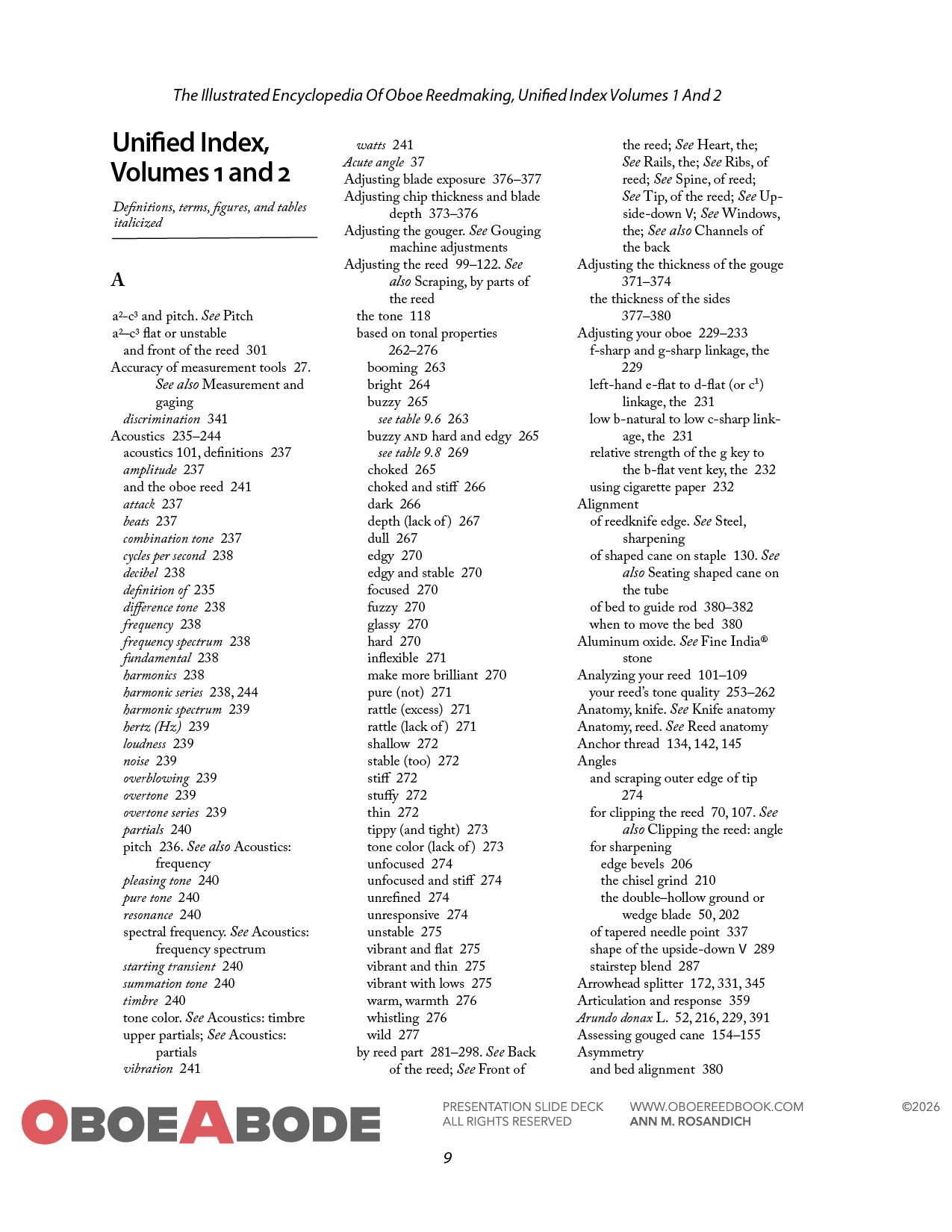 The new Unified Index for the Illustrated Encyclopedia of Oboe Reedmaking combines and improves upon the original indexes from both volumes 1 and 2 making it suitable to owners of one or both volumes.